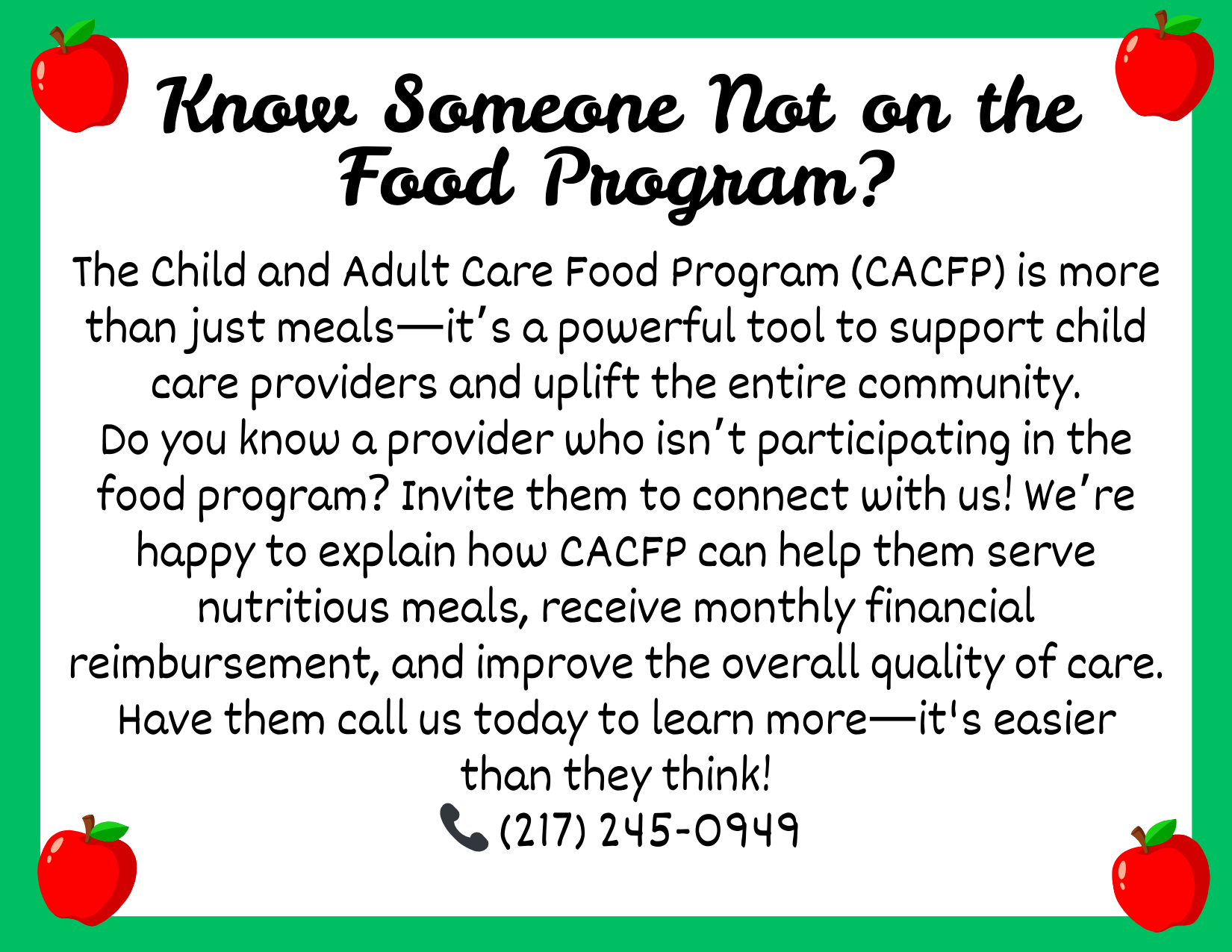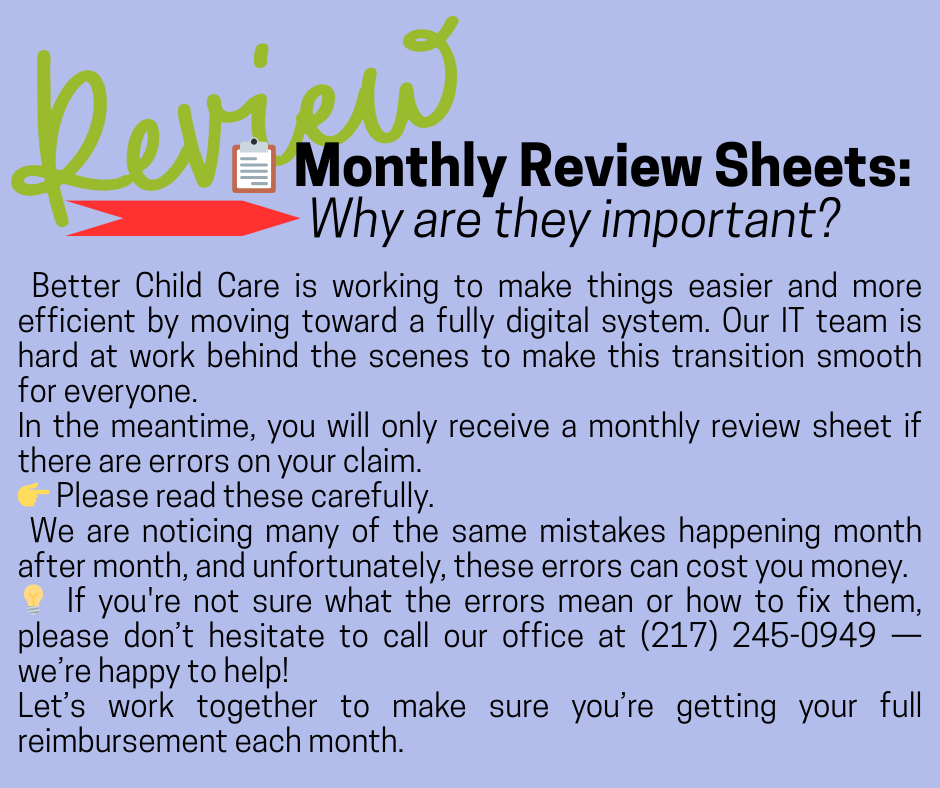 Accurate marking helps us process your claims quickly and confirms you’re meeting meal pattern requirements. If you have any questions about circling grains or milk types, give us a call at 217-245-0949 or email betterchildcare@mediacombb.net.